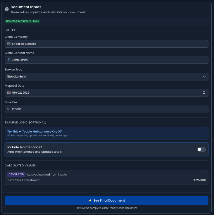 Change the inputs and see prices, hours, and sections update instantly in a real Google Doc.